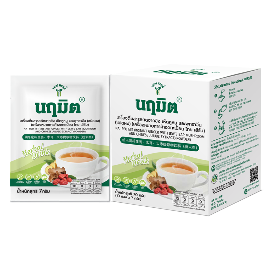 เครื่องดื่ม นฤมิต เป็นเครื่องดื่มที่คัดสรรวัตถุดิบสมุนไพร ขิง เห็ดหูหนูดำ และพุทราจีน ผ่านกระบวนการสกัดและกรรมวิธีการผลิตที่สะอาด ได้มาตรฐาน GMP จนเป็น "ผงเครื่องดื่ม สมุนไพร นฤมิต" พร้อมชงได้ทุกเมื่อ พกพาสะดวก เพียงฉีกซอง เติมน้ำร้อน จะได้สัมผัสกับ เครื่องดื่มเพื่อสุขภาพ รสชาติกลมกล่อม หอมกลิ่นสมุนไพร ปราศจากน้ำตาล ใช้สารให้ความหวานแทนสาสารสกัดจากหญ้าหวาน และอีริทริทอล เหมาะสำหรับคนที่รักสุขภาพ และเป็นของขวัญแด่คนที่คุณรักได้ทุกโอกาส ขิง ลดไขมันในเลือดและกระตุ้นการไหลเวียนของเลือด เห็ดหูหนูดำ ลดความดันโลหิตสูงหรือเลือดแข็งตัว และมีส่วนช่วยฟอกเลือด พุทราจีน เพิ่มภูมิต้านทานโรค บำรุงสมองและประสาท ลดการอุดตันของเลือดบำรุงไต