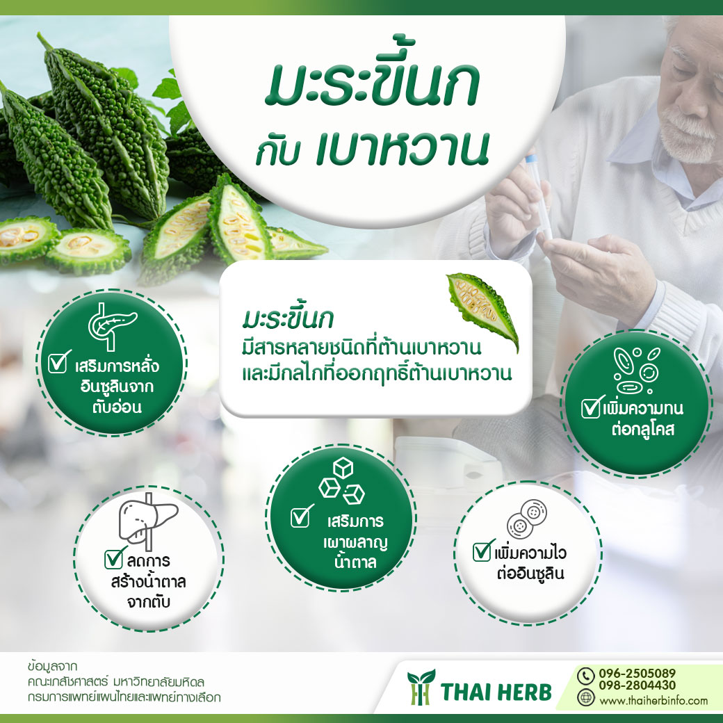 - สำนักงานกองทุนสนับสนุนการสร้างเสริมสุขภาพ. มะระขี้นกลดน้ำตาล. [บทความออนไลน์.] เข้าถึงได้จาก https://www.thaihealth.or.th