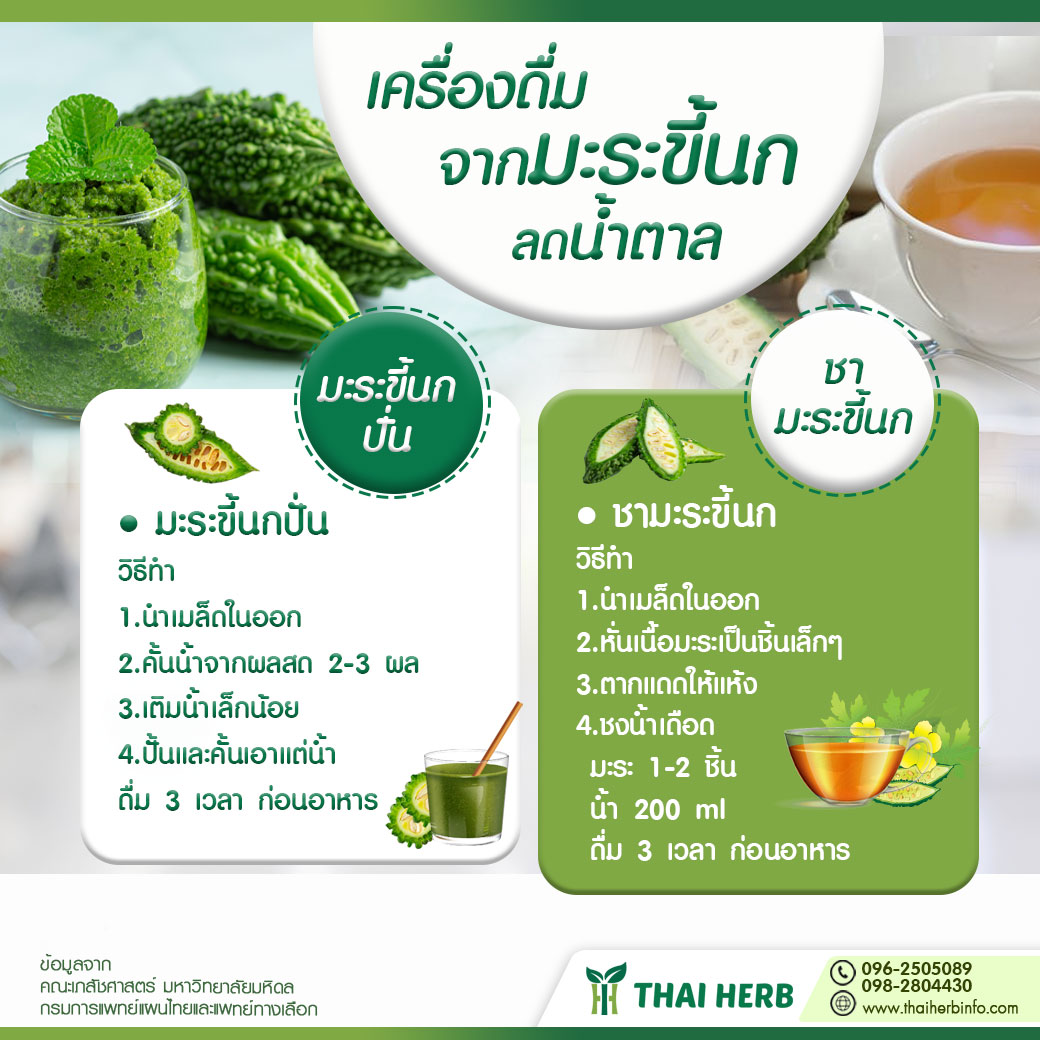 - ชามะระขี้นก นำเนื้อมะระผลเล็ก ผ่านำเมล็ดออก หั่นเนื้อมะระเป็นชิ้นเล็ก ๆ ตากแดดให้แห้ง นำมาชงกับน้ำเดือด (มะระ 1-2 ชิ้น ต่อน้ำ 1 ถ้วย) ดื่มเป็นน้ำชา ครั้งละ 1-2 ถ้วย วันละ 3 เวลา ก่อนอาหาร